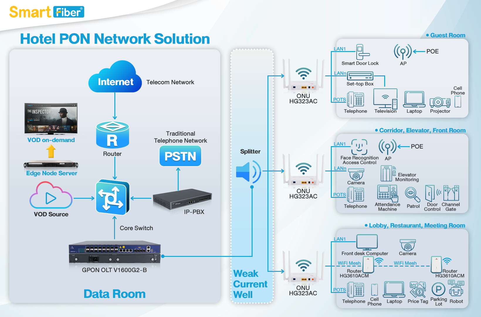 ทำได้มากกว่าด้วยเทคโนโลยีที่ทันสมัยที่สุด รวมทุกบริการ ทีวี ช่องสตรีมมิ่งโรงแรม โทรศัพท์ภายใน และอินเทอร์เน็ตความเร็วสูงไว้ในสายเส้นเดียว